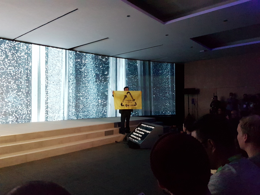 Samsung's MWC 2017 press conference is currently underway in Barcelona and while the company hasn't confirmed anything about the refurbished Galaxy Note 7, a protester from Greenpeace unfurled a flag and took a position on the stage's steps. The flag bears Samsung's logo, #GalaxyNote7 and a recycle logo with the words “Rethink, Reuse, Recycle.”