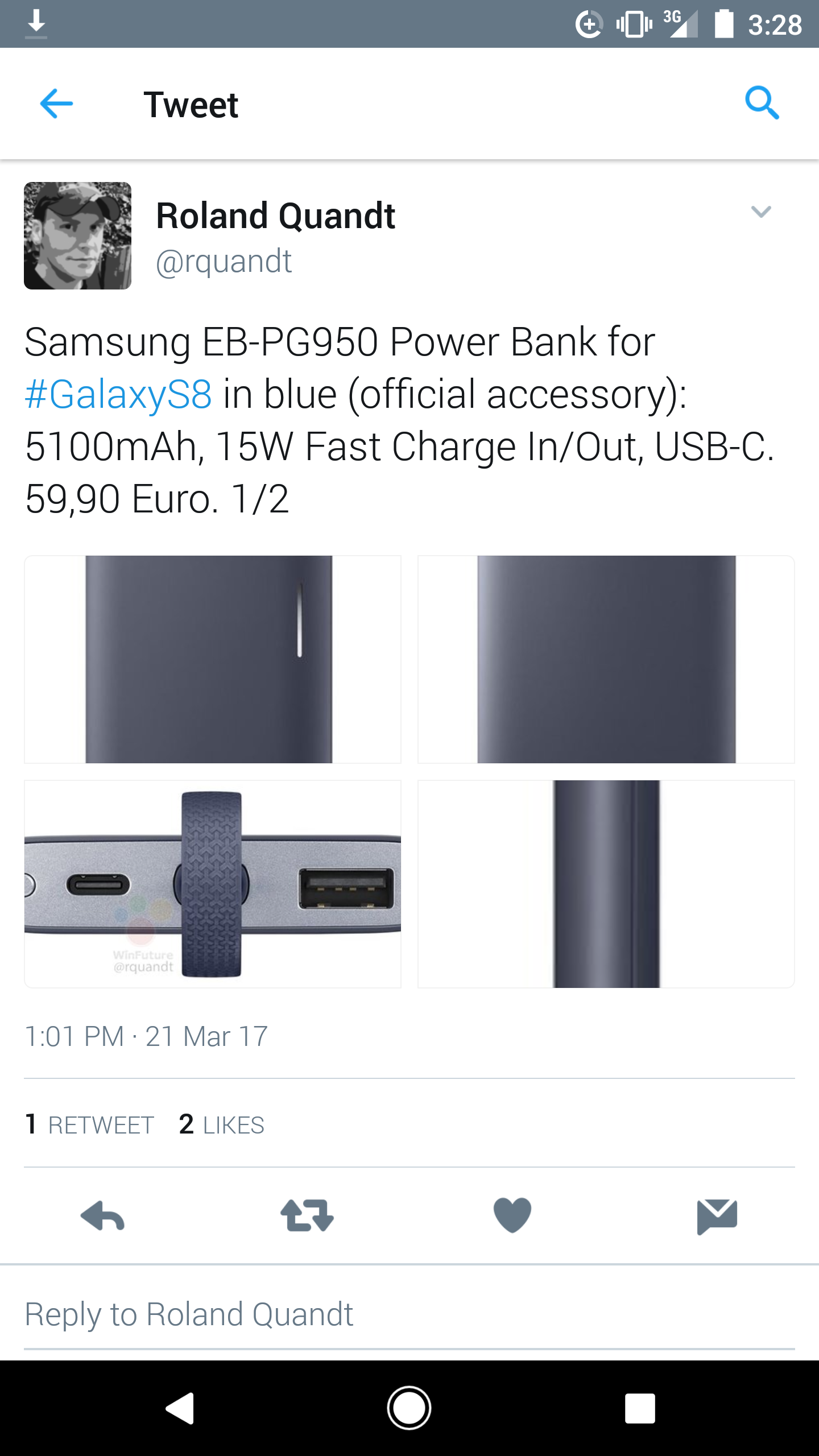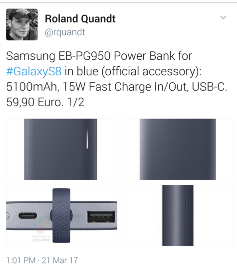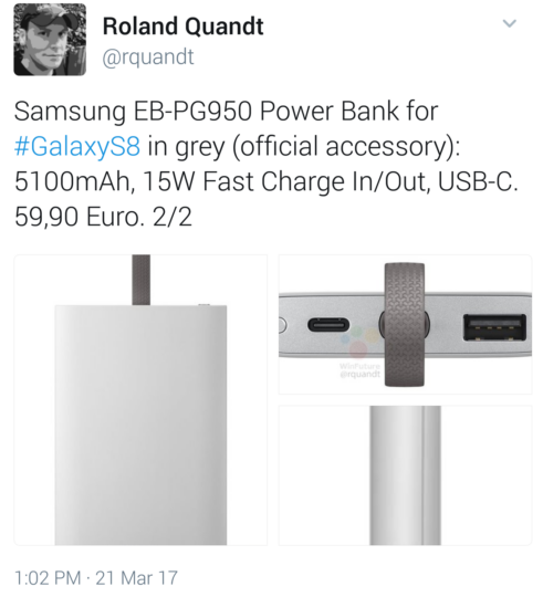 A new 5100mAh power bank has surfaced online in both grey and blue colors with USB Type-C charging and 15W Fast Charging capabilities. The model number, EB-PG950, reminds us that the model number for the upcoming Galaxy S8 is SM-G950, seeing that Samsung's cultural tetraphobia prevents the Korean giant from using the number “4” in its model number listing. This new accessory confirms USB Type-C charging for the Galaxy S8 (though leaks have already confirmed this long ago).