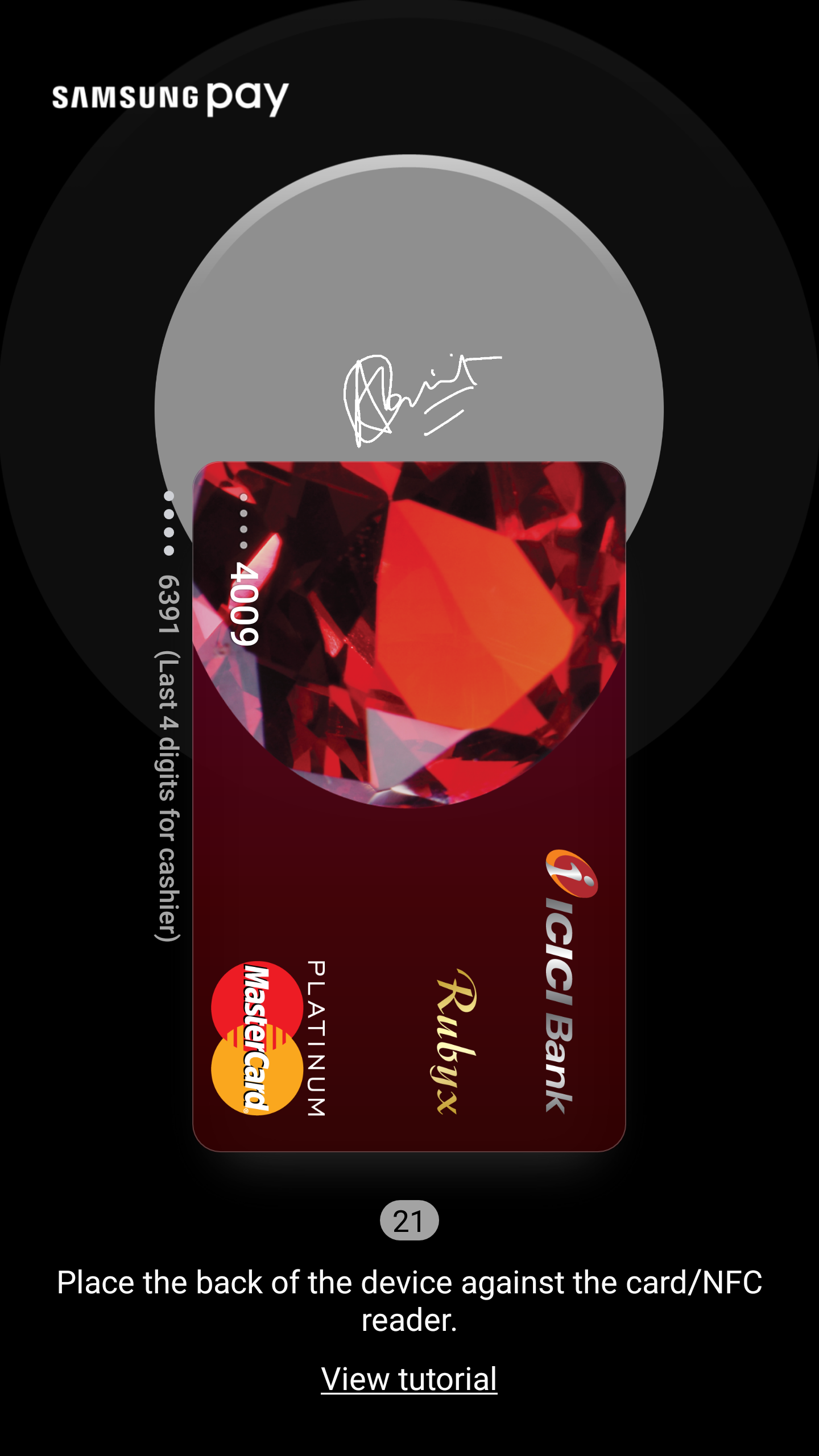 To be easily and quick accessible, the Samsung Pay app will always be running on your phone. The app can be launched by swiping up from the bottom of the screen when you're on the lock screen, home screen, and even when the phone's display is off. Once you've swiped up to open Samsung Pay, you can swipe between the cards to choose the one you want to use, then either place your finger on the home button or enter your PIN to fire up the actual payment screen.