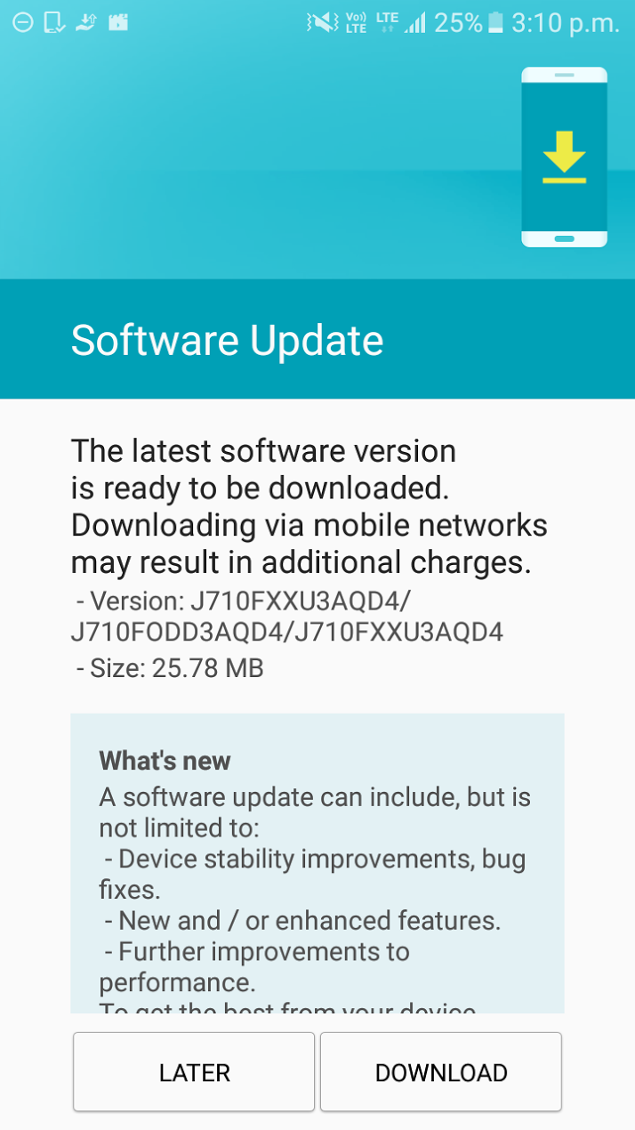 Firmware version J710FXXU3AQD4 is now being rolled out for the Galaxy J7 (2016) in India. Those who haven't received an over-the-air update notification already should expect it to pop up on their device very soon.
