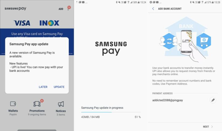 UPI support comes as part of a 84 MB update to Samsung Pay (the size may vary for you). You should get a notification that the update is available when you open Samsung Pay, and you can follow instructions after installing the update to add your UPI accounts. Still haven't gotten on-board with Samsung Pay? Check out our hands-on experience with Samsung Pay in India, and also take a look at our guide for setting up Samsung Pay on a supported device.
