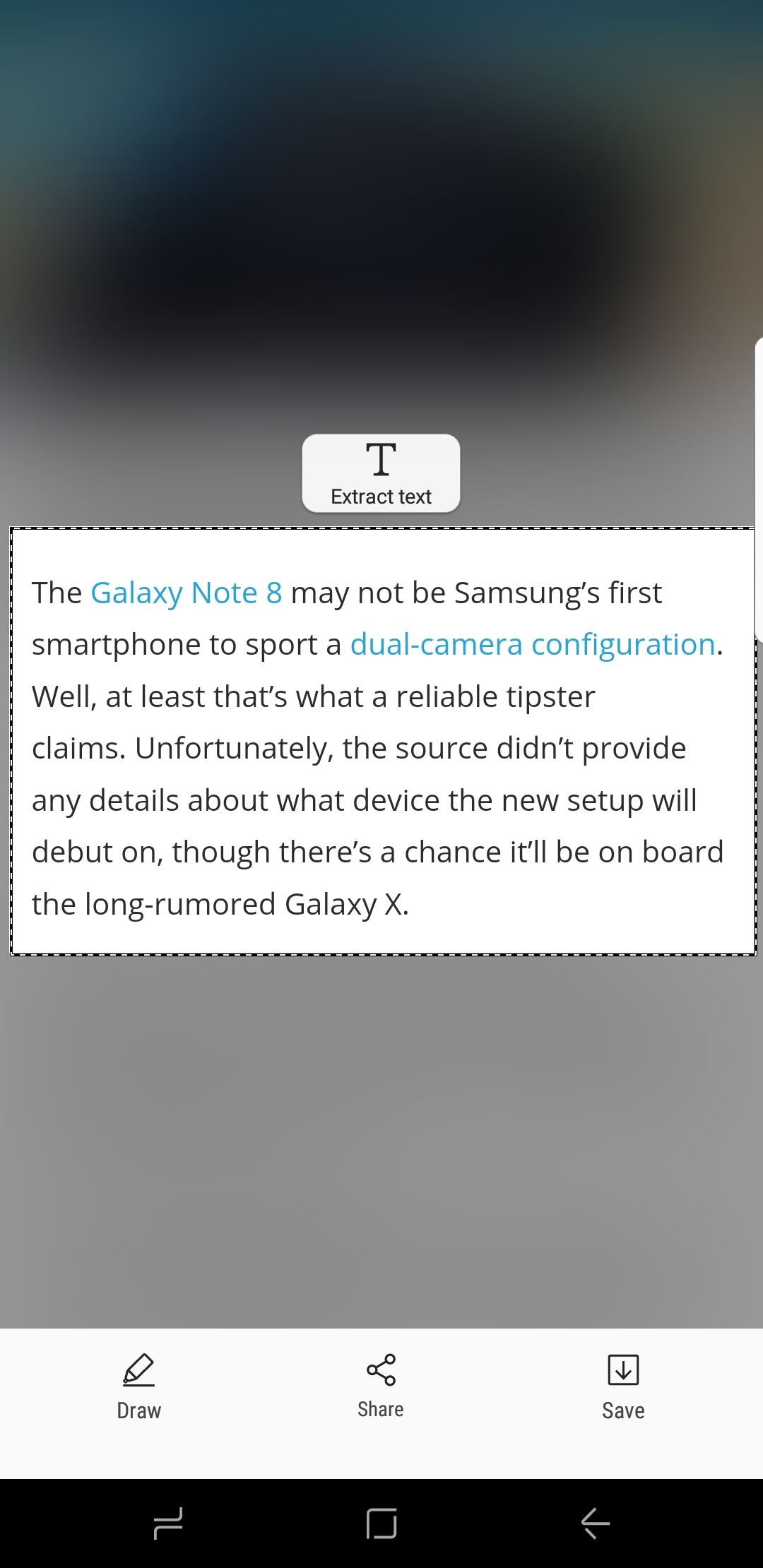 You should now see the captured screenshot on the screen, with various options for further actions. You can hit the Draw button to edit the screenshot, share it with other apps, or save it as an image in the gallery for editing or sharing later. If you've captured some text on the screen, you will also see an option to extract text. For first-time users, this might need an extra step of installing Samsung's optical reader app, but once you've done that, you can come back to the screenshot and hit the Extract text button again to grab the text for sharing or copying.