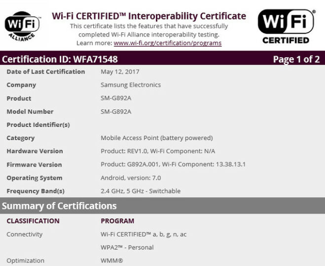 Like the user agent string, the Wi-Fi certification doesn't reveal any details except that the phone runs on Android 7.0 Nougat (and that it has the model number SM-G892A). If we follow the trend, the Galaxy S8 Active should have the same major specs as the Galaxy S8 while getting a battery that's larger than the S8+ (a 4,000 mAh cell, like the S7 Active, is plausible). It should also have MIL-STD-810G certification for advanced protection against damage, in addition to the IP68 water and dust resistance carried by the S8 and S8+. However, it remains to be seen if it will feature the Active key of its predecessors, in addition to the Bixby button.