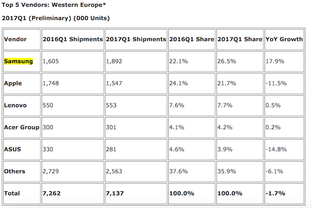 Samsung was one of the few major OEMs that posted year-over-year growth in the first quarter of this year. Not only did Samsung post growth, the company's tablets also pushed down the iPad to second place and made Samsung the top tablet vendor in Western Europe in the first quarter of 2017.