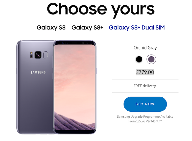The company isn't offering the Galaxy S8 in unlocked and dual-SIM flavor, only the Galaxy S8+. It can be ordered right now from Samsung UK's online store for £779 in both Midnight Black and Orchid Gray colors.