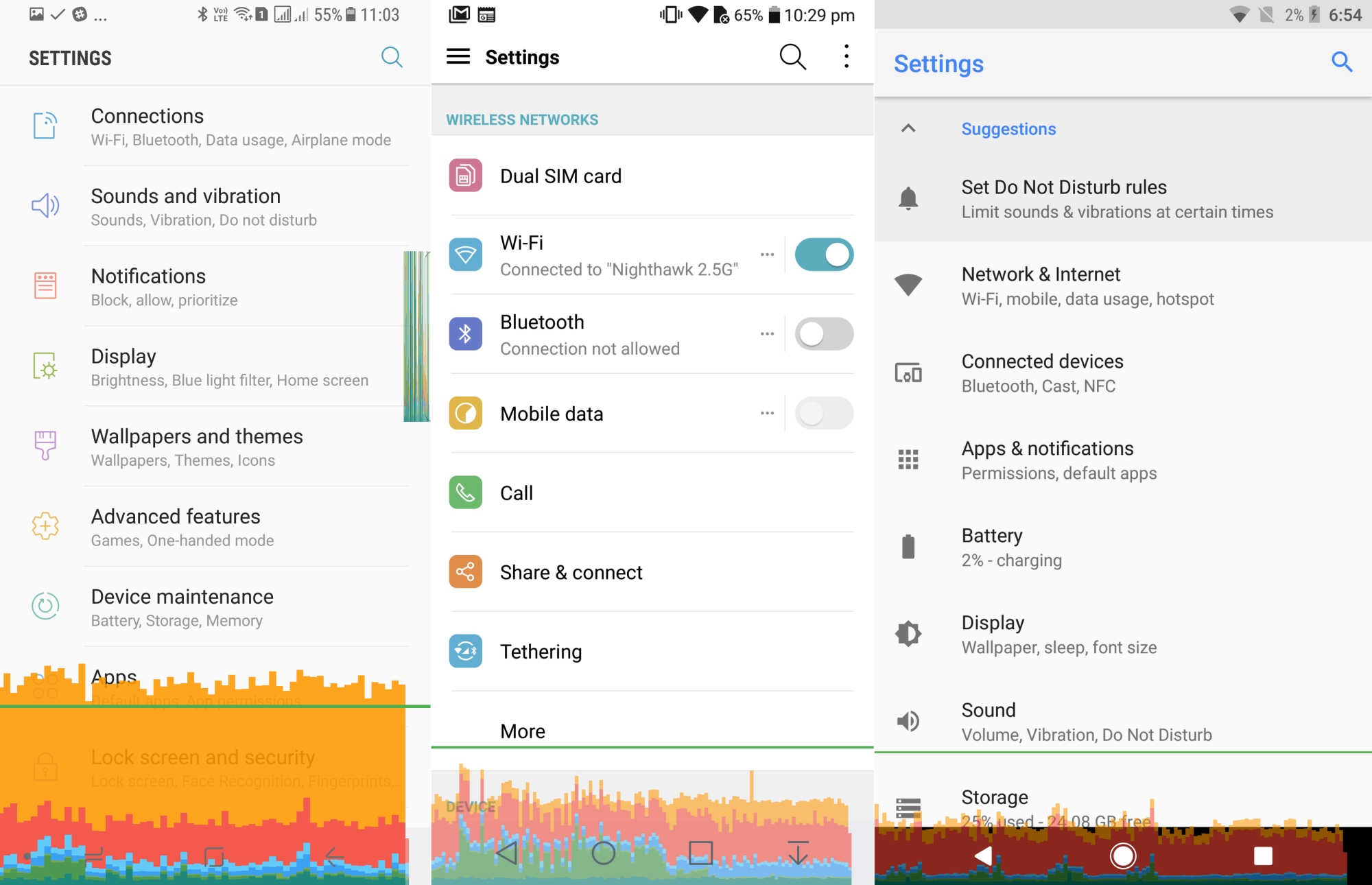 Here are rendering profiles for the Galaxy S8+, LG G6, and the Google Pixel (from left to right) in their settings menus (the screenshots were taken after scrolling up and down a few times):