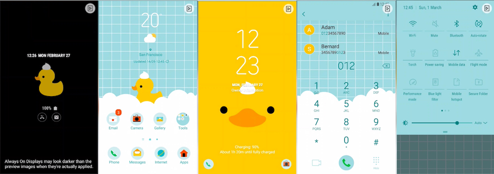 This week's list of best themes also consists of two new themes from MINU – Diamond Pink Purple and Diamond Purple Blue – that have wallpapers and backgrounds inspired by diamond shapes. The [Walk On Mars] Orange Web theme has a 3D-esque wallpaper, an AOD wallpaper, and a themed on-screen keyboard. The Duck (AOD) theme pack looks casual and fun due to its AOD wallpaper and the pastel blue color used in its background. The Egypt _MINDON Design and Santorini _MINDON Design themes are inspired by popular tourist destinations.