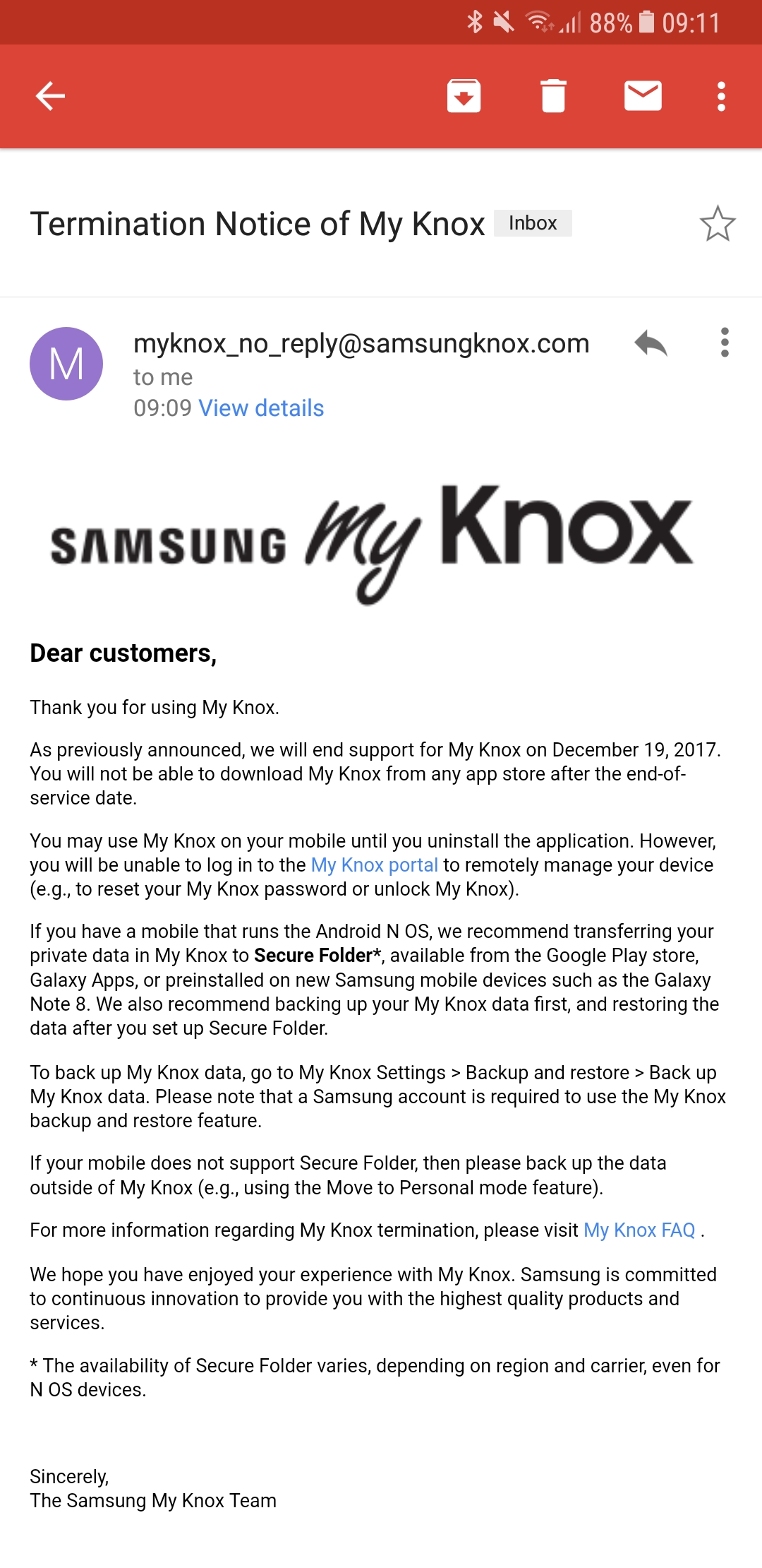 My Knox users won't be able to update—or install—the application from Galaxy Apps after the end-of-service date; however, they'll still be able to use the platform to access their files, and even create new content, until they switch smartphones—or make the leap to Secure Folder.