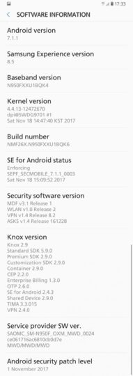 In addition to the November security patch, the update brings improved performance in the Calendar, Gallery, Voice Recorder, and Reminder apps, a new secure Wi-Fi function, and a fix for an unexplained Samsung DeX error. The firmware version is N950FXXU1BQK6, and at upwards of 840 MB, is among the biggest OTA updates that don't bring a major Android version upgrade that we have seen. But then again, with the time Samsung has taken to actually give us an update, it doesn't surprise us all that much. Hopefully, future updates won't take as long, especially those that bring the ever-so-important Android security patches.