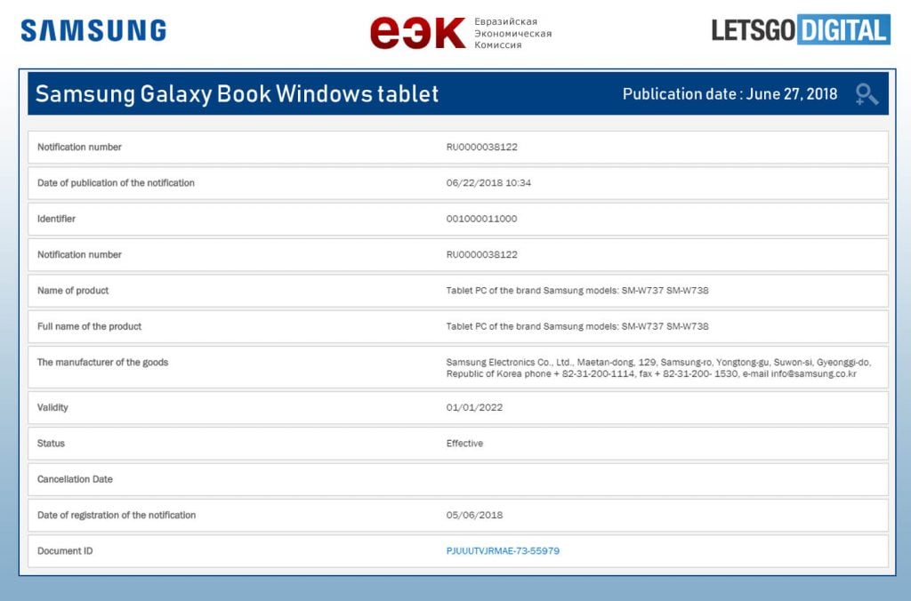 It appears Samsung is working on a successor to the current Galaxy Book. Samsung Windows devices with model numbers SM-W737 and SM-W738 along with their variants SM-W737A, SM-W737N, SM-W737V, and SM-W738N were certified by the Russian agency EEC recently. The many model numbers in the listing probably refer to WIFI, LTE, and other variants of the new Galaxy Book.
