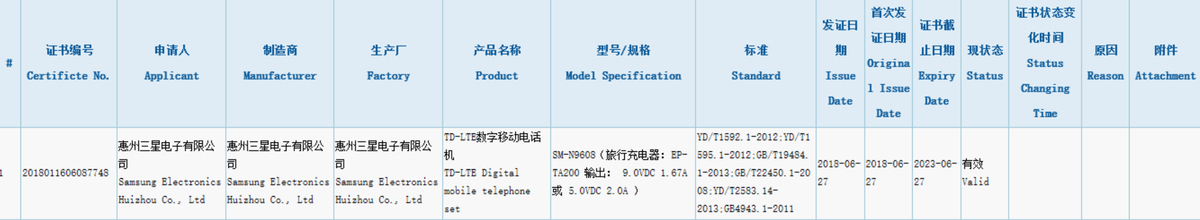 The Galaxy Note 9 model number SM-N9608 has been certified by the agency. The listing mentions that the device supports power input of 9V DC/1.67A or 5V DC/2A with fast wireless charging. It has support for the country's TD-LTE bands.