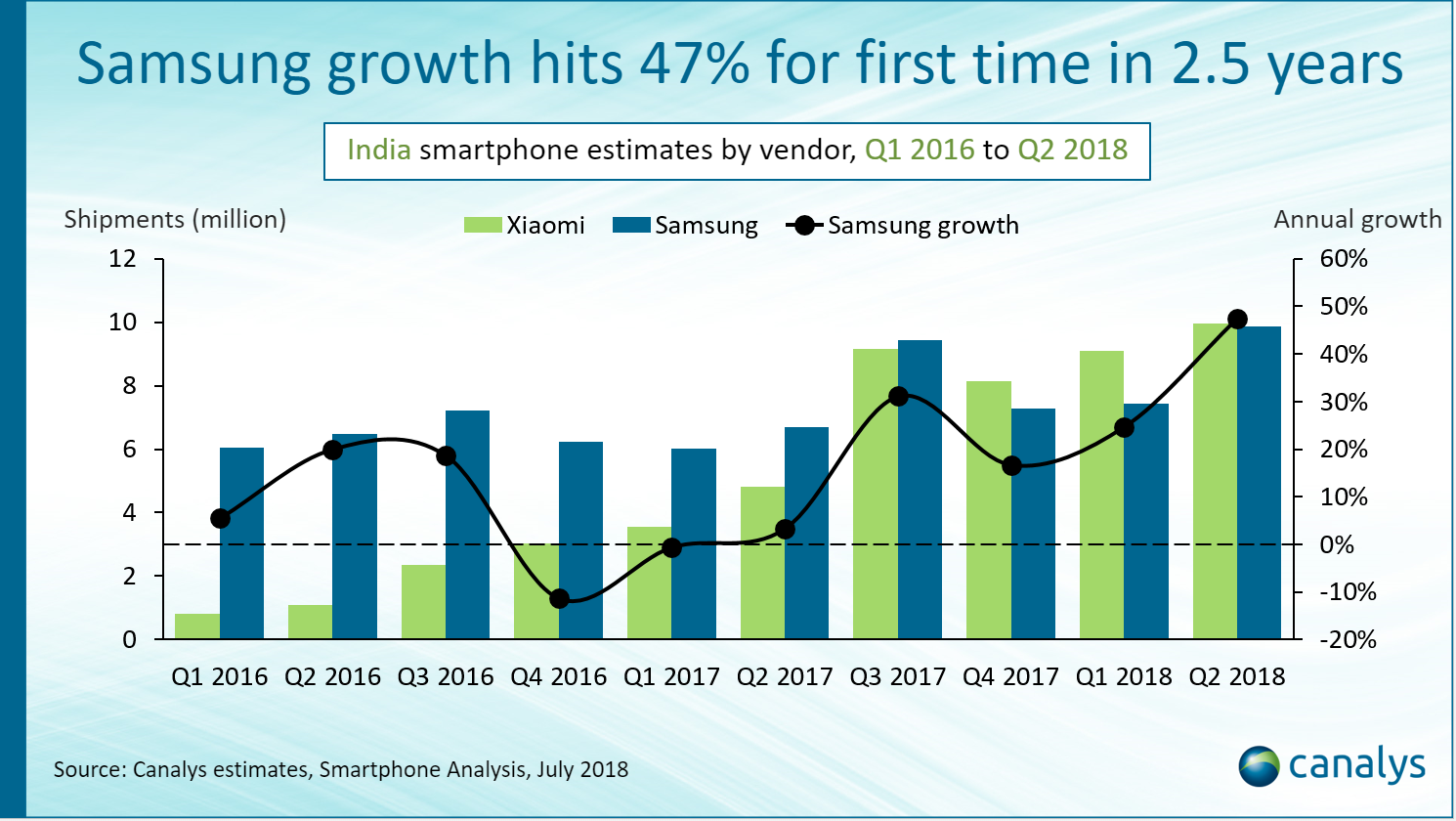 Reversing the disappointing performance in the last few quarters in India, Samsung put up a good show and almost beat Xiaomi to reclaim the top spot. The Korean company grew 47% year-on-year by shipping 9.9 million smartphones and garnering 30.2% market share in Q2 2018, up from 25% in the same quarter last year. This impressive performance, however, was not enough for Samsung to topple Xiaomi which emerged as the largest vendor once again.