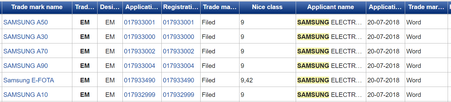 The company has filed trademarks for the Samsung A10, A30, A50, A70 and A90 monikers in addition to Samsung E-FOTA in the European Union. The aforementioned names will be used for “Smartphones; mobile telephones; tablet computers,” according to the filing documents. The company has also filed to trademark the Galaxy A30 and Galaxy A50 names in South Korea. The E-FOTA trademark is for something else entirely. It a Firmware Over The Air update method for Samsung Knox.