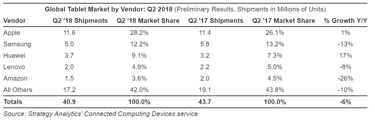 The Q2 data from Strategy Analytics echoes IDC's findings but with slightly different numbers. Strategy Analytics says the global tablet market declined 6% annually to 40.9 million units in the second quarter of 2018. Samsung is again placed second in the vendors' list with a 12.2% market share and 13% YoY decline in shipments.