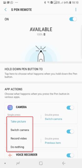 Step 3: Okay, so let's take a look at how you can choose what happens when you press the S Pen button. It's simple: Among all the apps listed in the S Pen remote customization menu, such as Camera, Gallery or Voice Recorder, you can tap the Single press option or Double press option to choose what each will do. You can also disable the S Pen remote from working in a particular app by using the toggle next to the app's name.