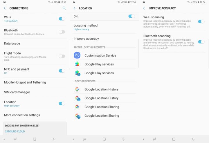 Go the extra mile and disable Wi-Fi and Bluetooth scanning to improve location accuracy. This feature is enabled by default and will continue to allow apps and services to scan for Wi-Fi and Bluetooth even when they're turned off. You'll find the option in the Settings app's Connections menu. Tap on Location followed by Improve accuracy to access the toggles.