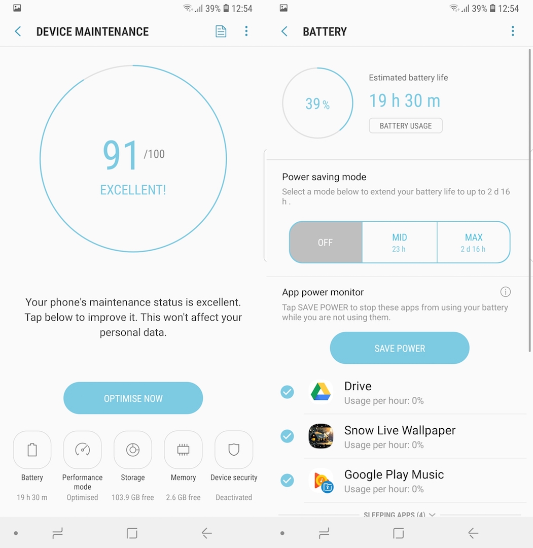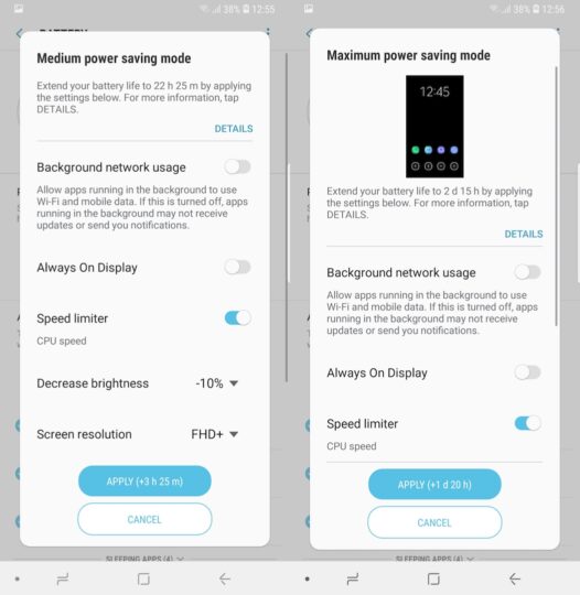 The relevant options can be found in the Battery section of Device maintenance, accessible via the Settings app. The Medium and Maximum modes will make several adjustments to improve battery life on Galaxy Note 9. Tap on any one of the modes to see an overview of the adjustments made to prolong battery life.