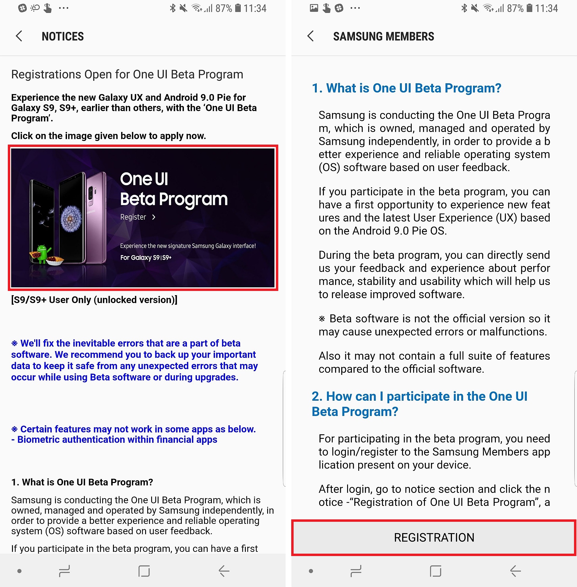 To register for the beta program, open the Samsung Members app on your phone, then tap on the notice that says Registrations Open for One UI Beta Program. Tap the image on the next screen, then hit the Registration button at the bottom and agree to the terms and conditions to finish registration. Once registered, you can download the Pie beta by going into the Software update menu of the phone's settings and tapping Download updates manually.
