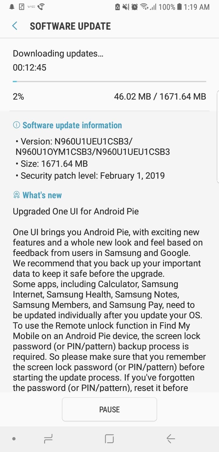We have seen reports from multiple users that the US unlocked Galaxy Note 9 Pie update is finally rolling out in the country. For those keeping an eye out, it's firmware version N960U1UEUCSB3. It's rolling out over-the-air and is also available for download from our firmware section. The update weighs just under 1.7GB and brings the February 2019 security patch.