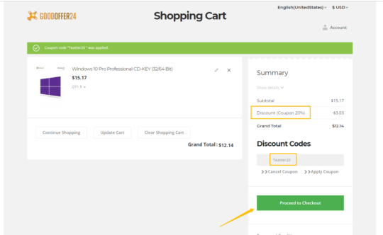 Once that step is done, go to your Shopping Cart, click the “Apply Coupon” button – and enter the discount code “Teaster20” there. By confirming, you’ll see the discount being deducted from the original value: