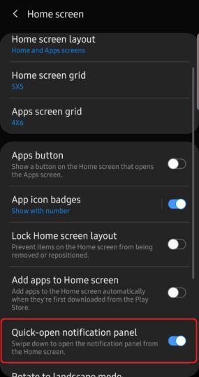Step 3: In the home screen settings, enable the Quick-open notification panel option.