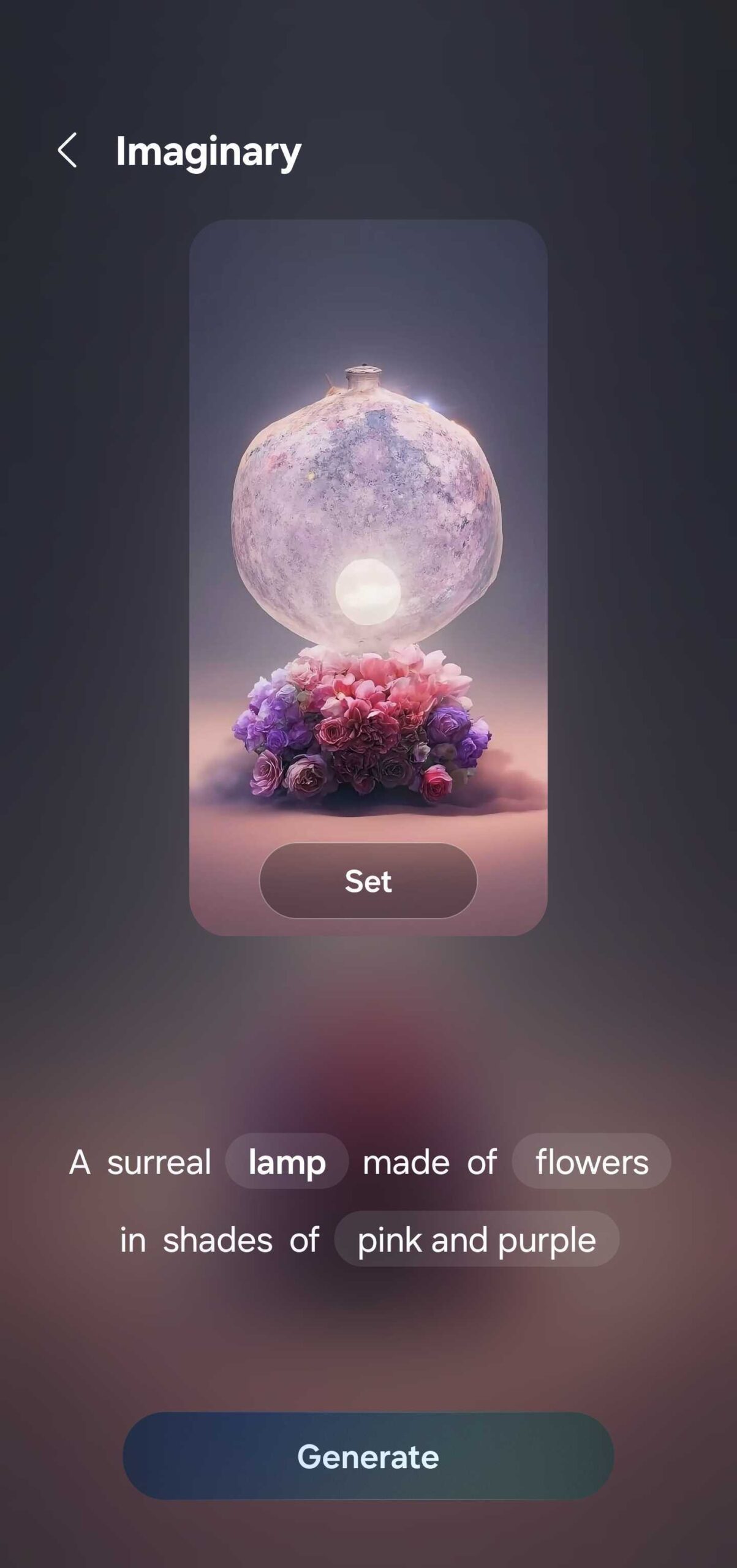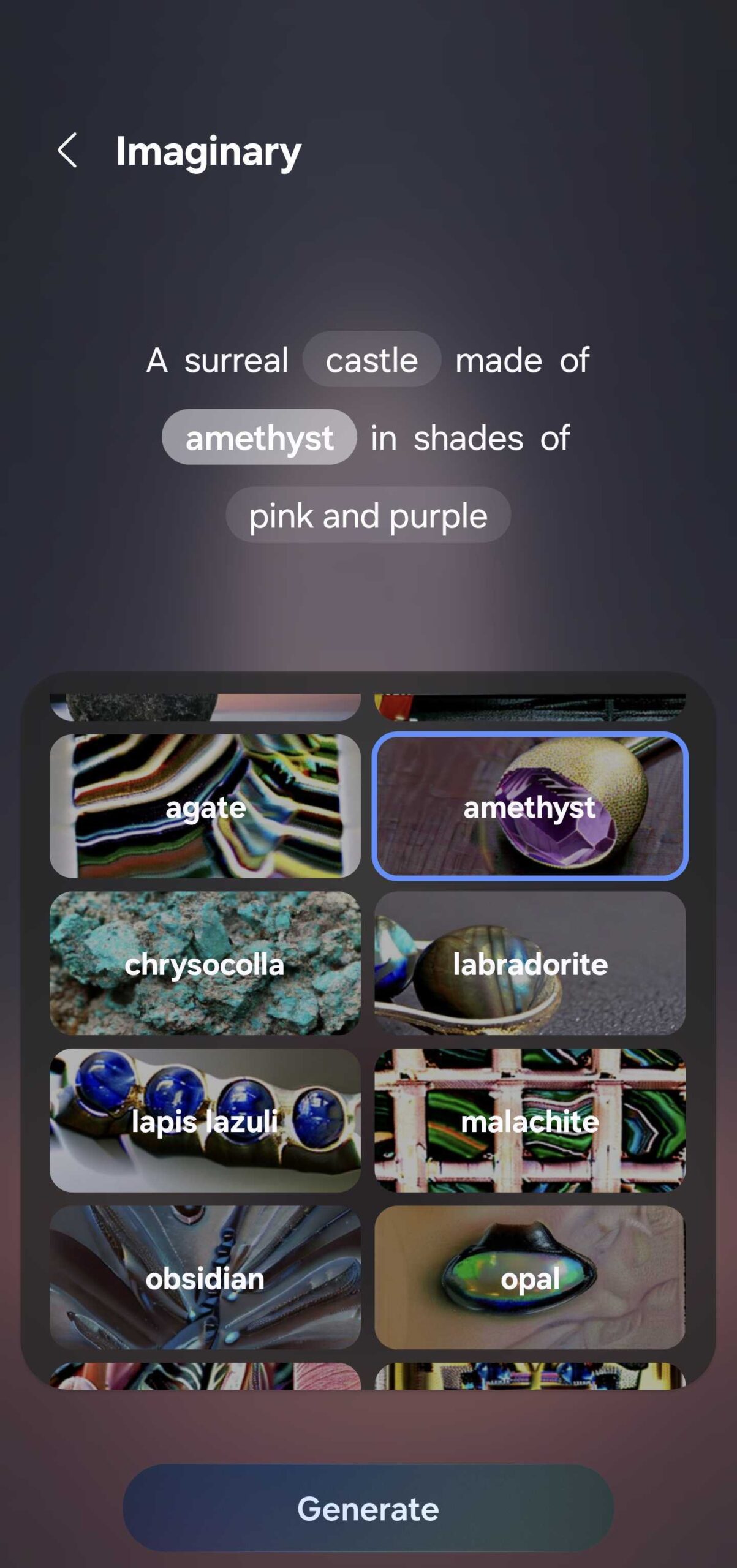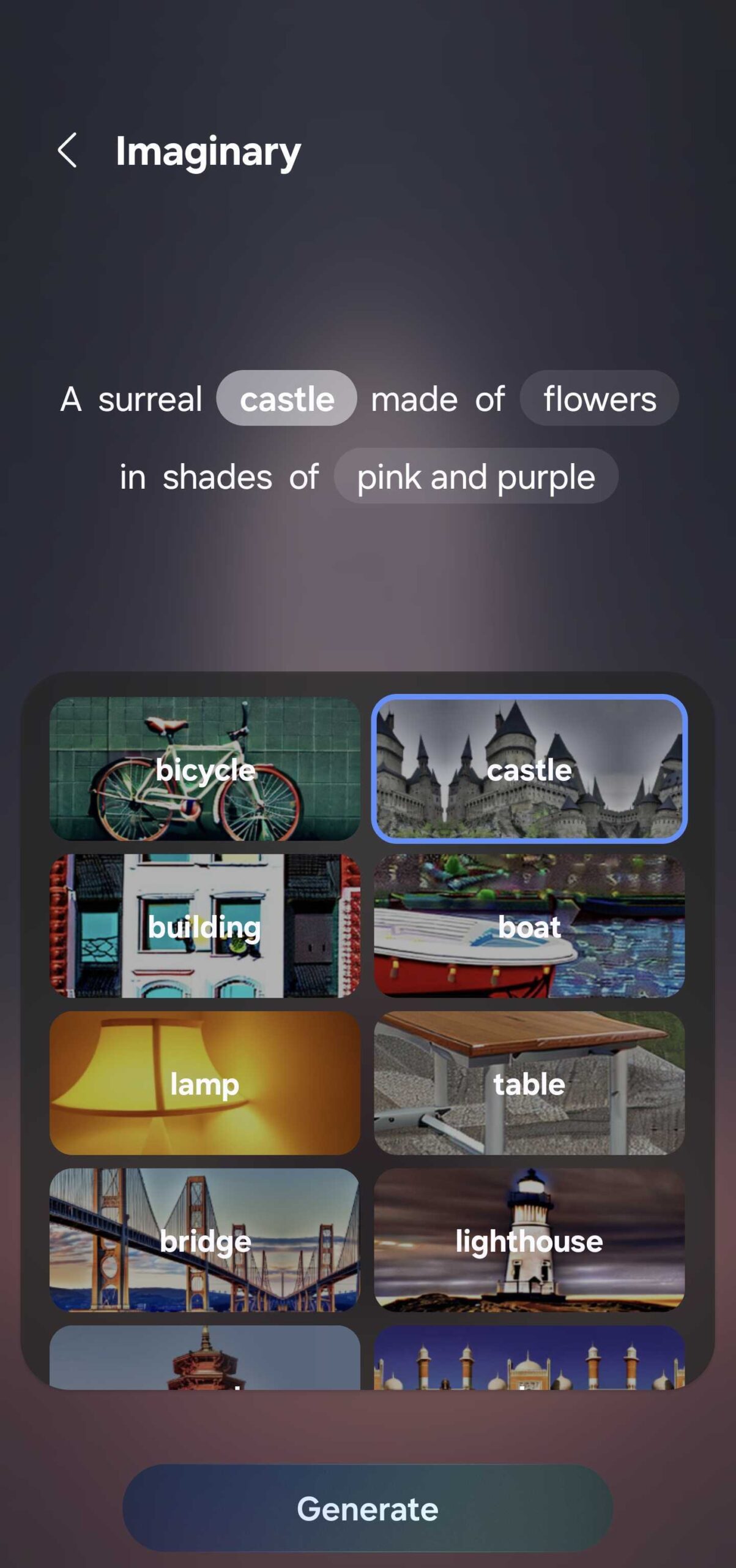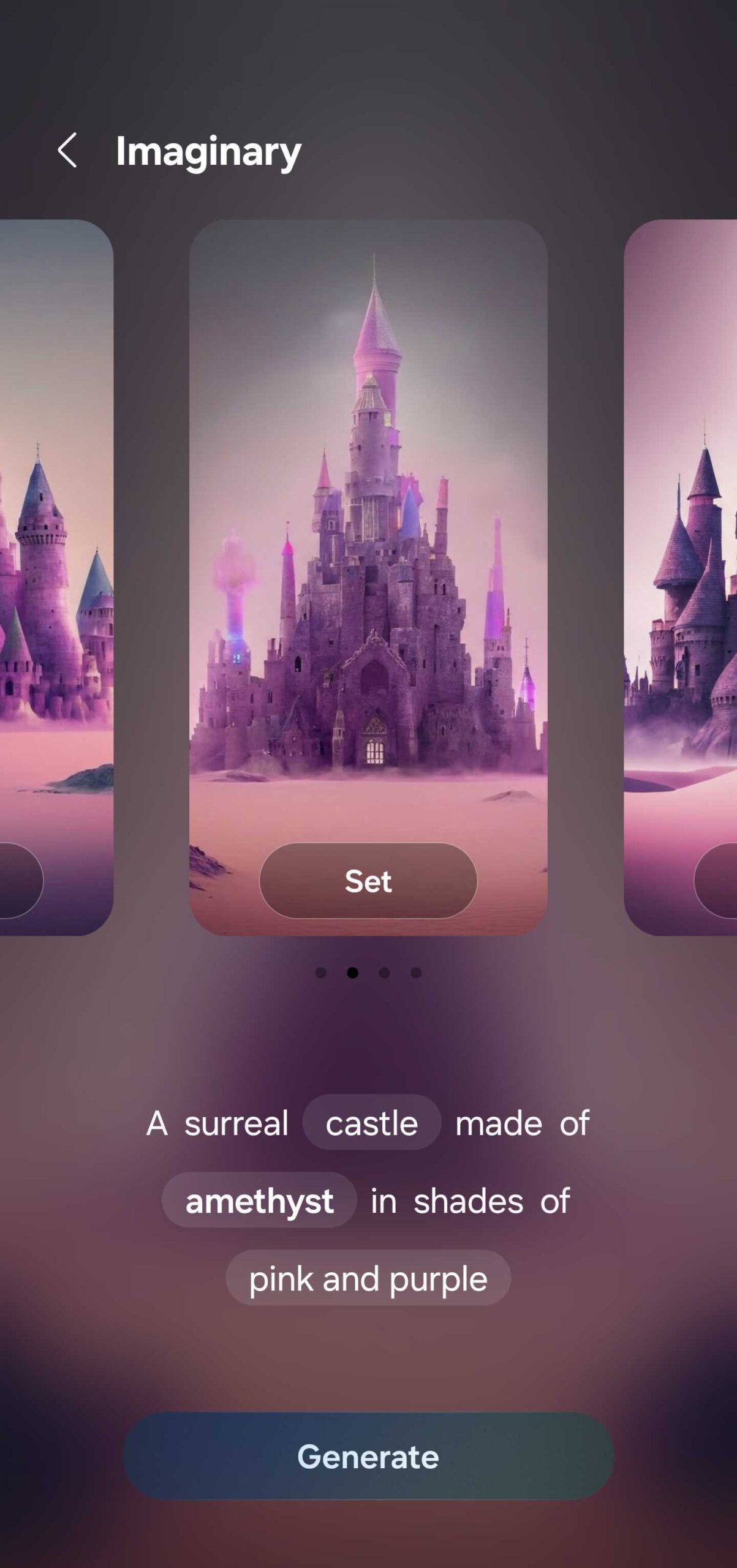 The Generative wallpaper tool offers endless color and shape variations. For example, you can make AI images of a castle made out of cloth or a precious mineral. And you can generate wallpapers in different styles when you choose the “Painting” option. Styles include: