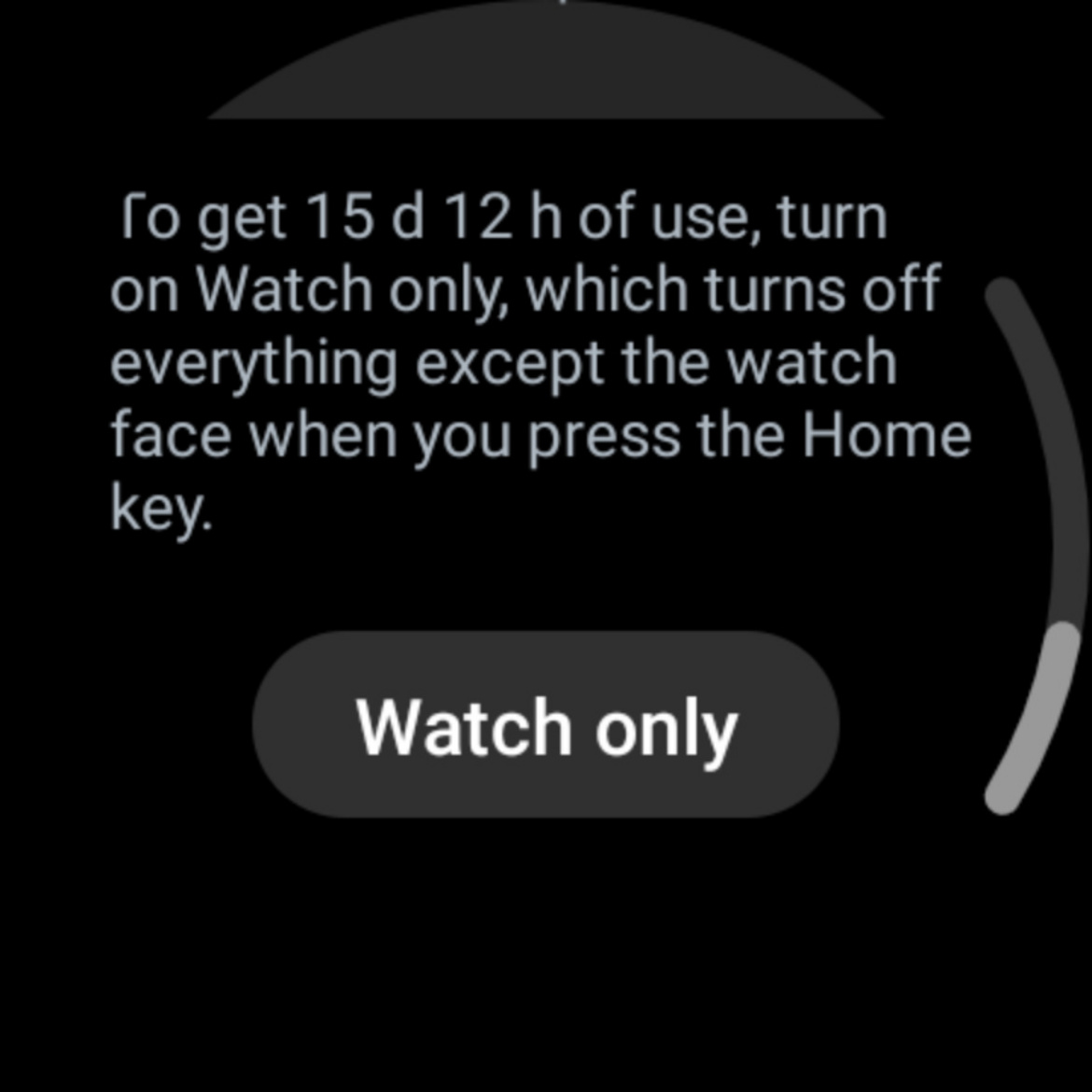 Swipe up or down on the watch face and access the Settings app on your Galaxy Watch. Go to “Battery” and scroll all the way down. Here, your watch will estimate how much battery life you can gain by enabling “Watch only.” This varies by model and battery size. A brand-new Galaxy Watch 5 (44mm) can show an estimate of close to 16 days. When you're ready, tap “Watch only” and then “Turn on” to confirm.