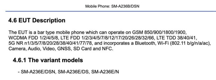 The Galaxy A23 5G is identified by model number SM-A236E. Other variants were also spotted, including SM-A236M and SM-A236B. The phone has dual-SIM capabilities, dual-band Wi-Fi 5, Bluetooth 5.0, and NFC. (via MySmartPrice)
