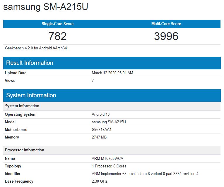 The Helio P35 chipset was built by TSMC on a 12nm FinFET process and comprises a total of eight ARM Cortex-A53 CPU cores in a single cluster, operating at a maximum frequency of 2.3GHz. The CPU is paired with an IMG PowerVR GE8320 graphics chip clocked at 680MHz. The chipset supports a maximum of 6GB of RAM, and while there is no guarantee that the Galaxy A21 will have more than 3GB, Samsung could offer at least a 4GB variant to match last year's Galaxy A20s configuration.