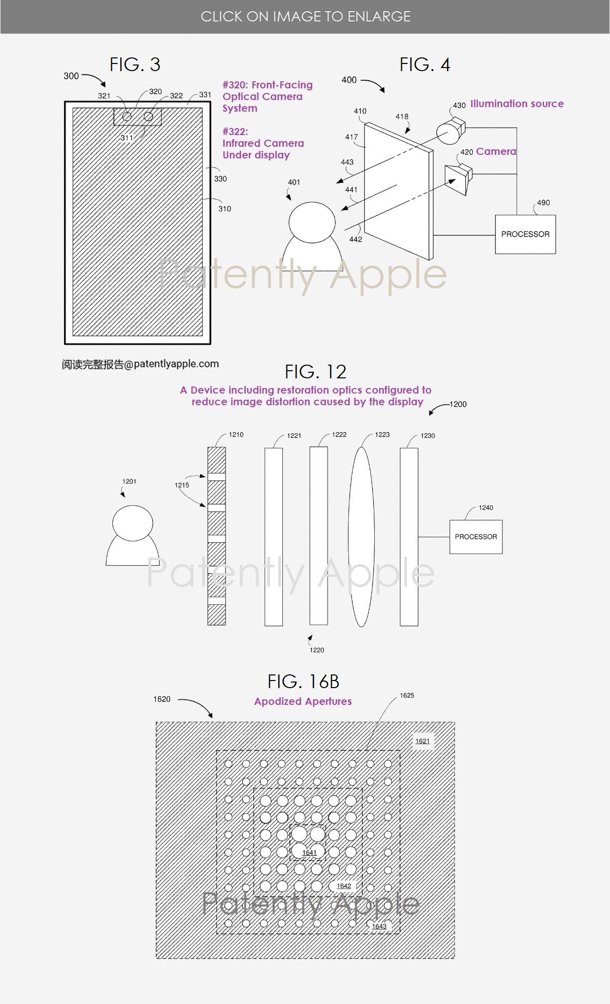 The patent describes an under-display camera system similar, at least in principle, to the one used by Samsung's UPC camera hidden behind the foldable display of the Galaxy Z Fold 3 and Galaxy Z Fold 4. However, Apple's under-display camera system also appears to have a light source, which presumably refers to infrared light used by the Face ID technology. (via Patently Apple)