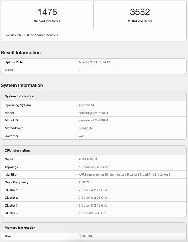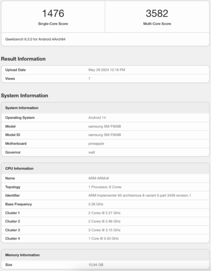 One unusual detail about this new Geekbench entry for the SM-F956B is the benchmark score. The international model yielded considerably lower scores than the US version: roughly 500 fewer points in single-core tests and nearly 50% less in multi-core.