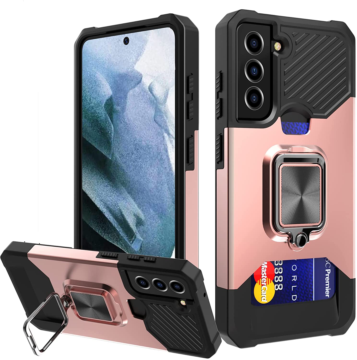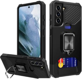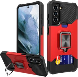 Similar to the Renmou Case, the Galaxy S21 FE Wallet Case combines a magnetic backplate — for car mounts — with a ring and a kickstand. But, in addition to these features and a rugged design, it also features a credit-card-sized compartment.