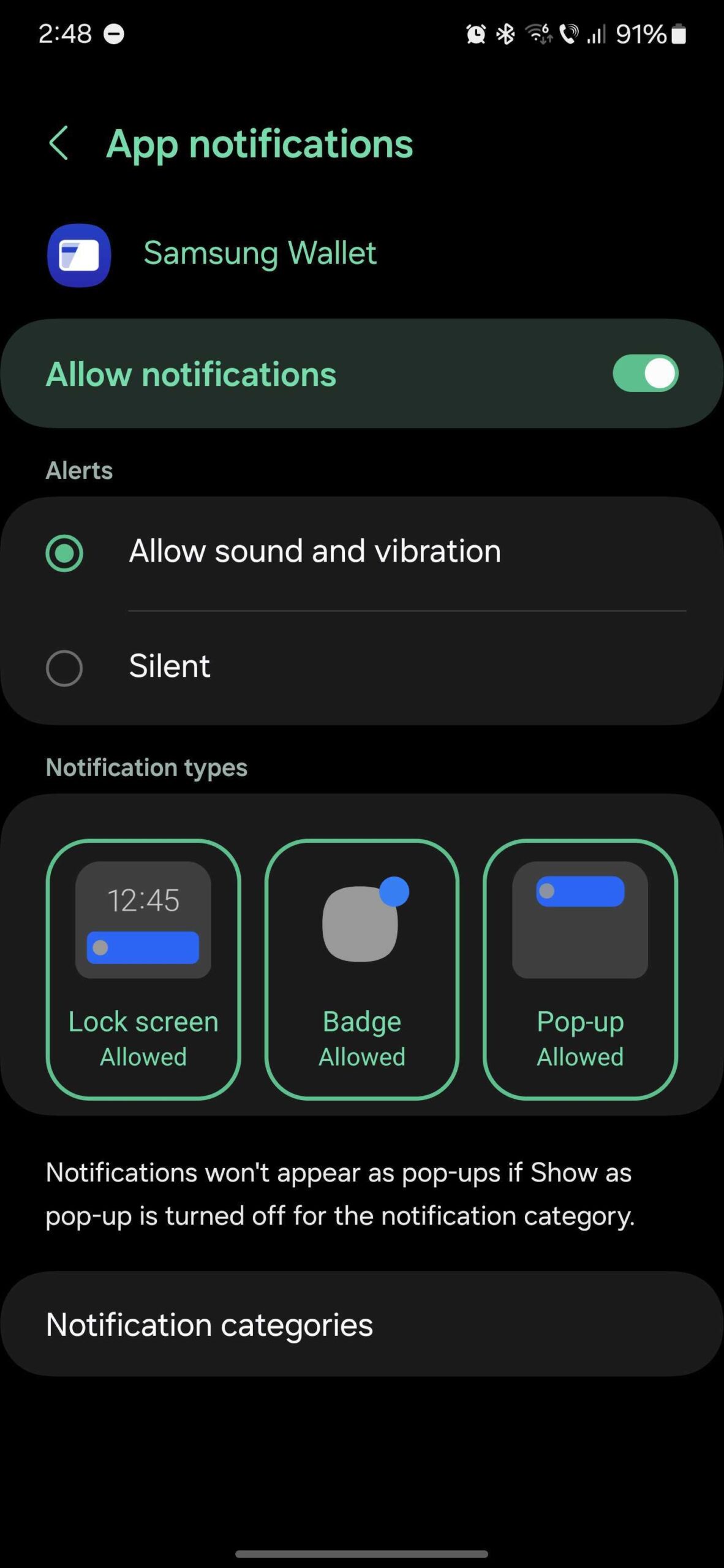 The clever Notification Categories feature gives you control over which notification types you want to keep receiving and which ones you don't for each app individually. For example, you might be interested in getting Samsung Wallet notifications about your transfers, but you may want to turn off Wallet notifications about promotional offers.