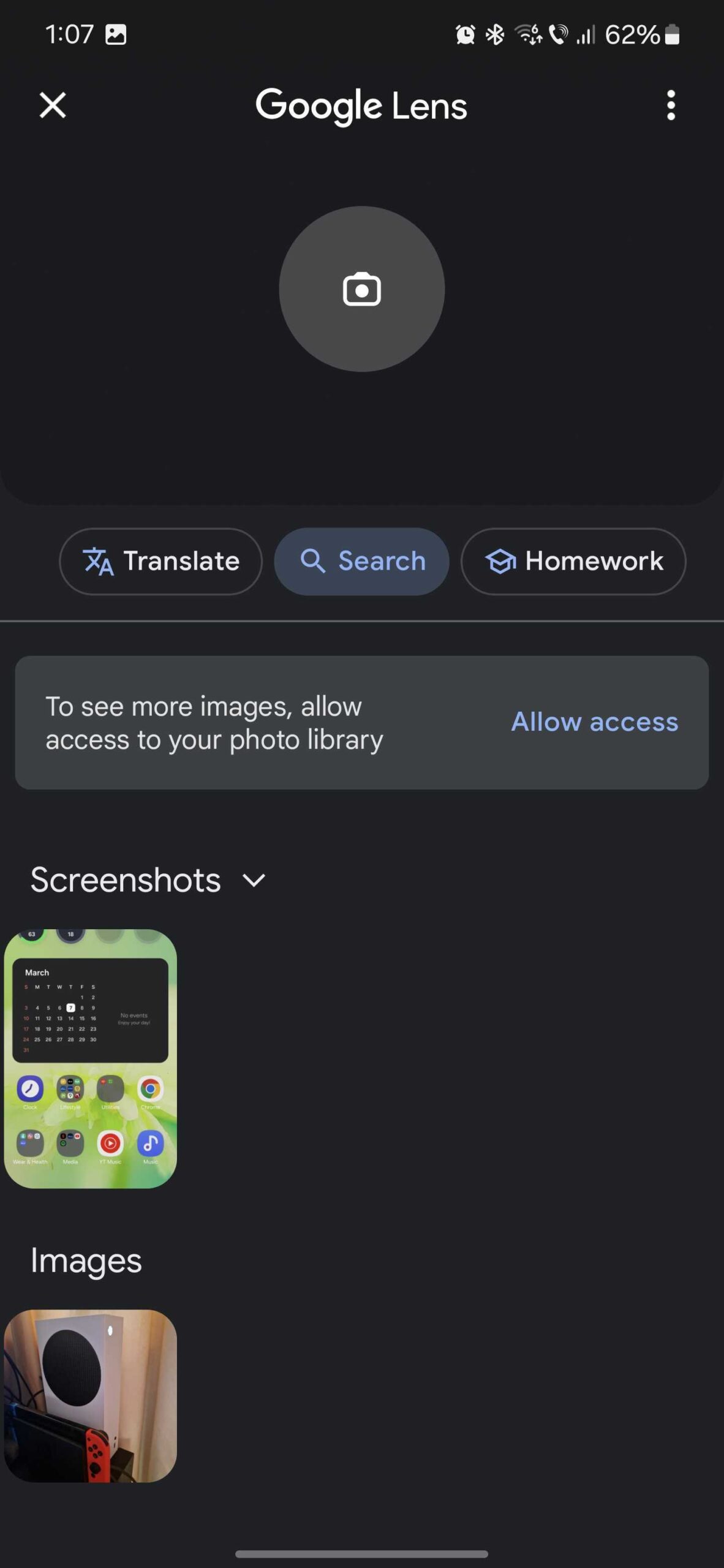 Google Lens may ask you for storage and camera permissions. Once you grant them, you can search by image in two ways: by capturing photos with your Galaxy S22 or Galaxy S23 camera or by uploading an image from your Gallery.