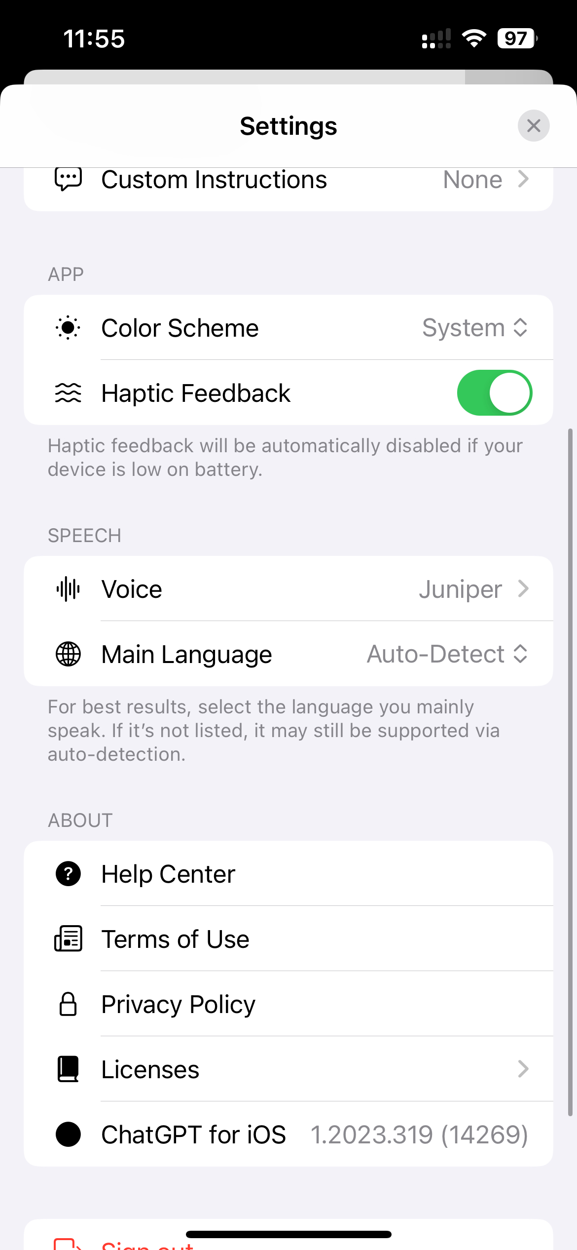 To enable this feature, go to Settings and enable the Voice option. You can choose from five different voices: Breeze, Juniper, Ember, Sky, and Cove. Once you enable this feature, you can access it by tapping on the headphone icon beside the text-input field, which will bring up a special window.