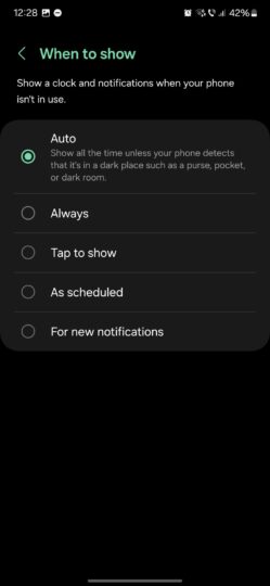 To use Auto mode, open the Settings app on your phone, go to “Lock screen and AOD,” tap “Always On Display,” tap “When to show,” and select “Auto.”