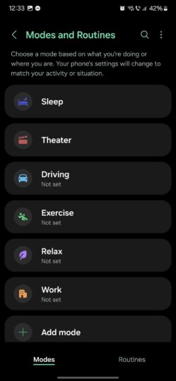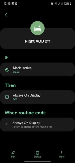 In this particular use case, you can use Modes & Routines to tell your phone that you want the Always On Display feature to turn off automatically whenever your device enters Sleep Mode. That way, it won't stay up all night and won't bother you while you sleep.
