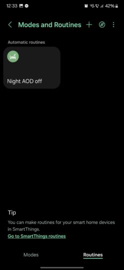 If you've never used Modes & Routines, this is probably the best way to get acquainted with the concept and how it all works. So, open the Settings app, access “Modes and Routines,” go to the “Routines” tab at the bottom, tap “+” and select “Mode active – Sleep” in the “If” field and “Always On Display Off” in the “Then” field.
