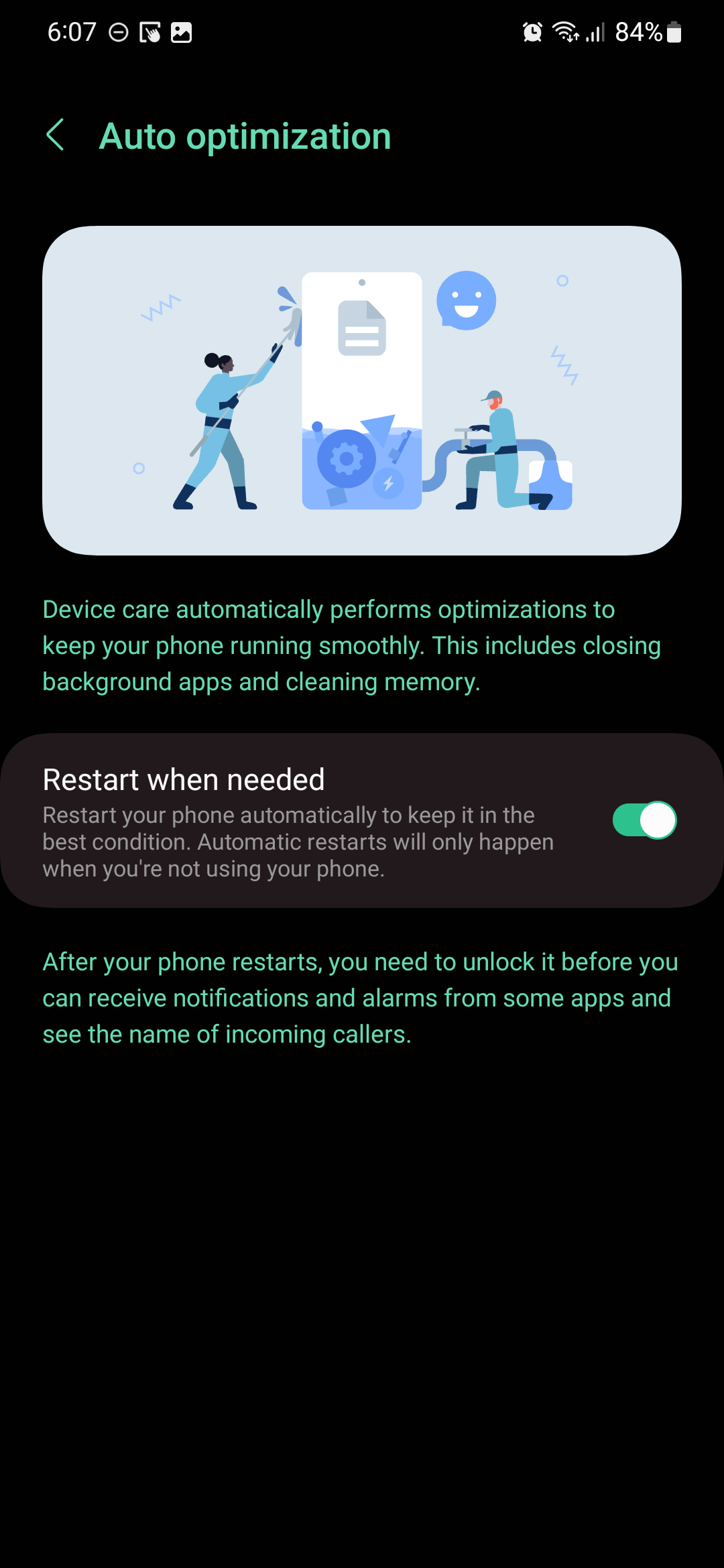 And as a side note, you can set your Galaxy phone to restart automatically when needed. You can enable this feature in One UI 5.0 by opening the Settings app, accessing “Battery and device care,” tapping “Auto optimization,” and switching the “Restart when needed” toggle ON. The automatic restart will only happen when you're not using your Galaxy phone.