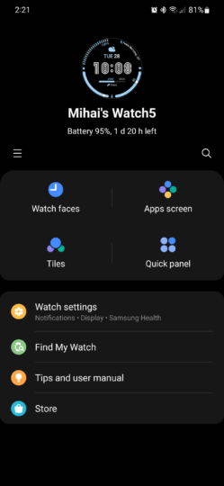 Alternatively, you can dive deeper into Samsung smartwatch watch faces and customization options by using the Galaxy Wearable app on the connected smartphone. Open the app and tap “Watch faces.”