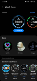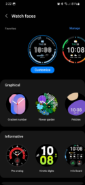 All the preloaded and downloaded watch faces can be viewed and managed inside the Galaxy Wearable app by accessing “Watch faces” and then scrolling the “Favorites” list left or right or tapping “Manage” in the upper-right corner for a list view.
