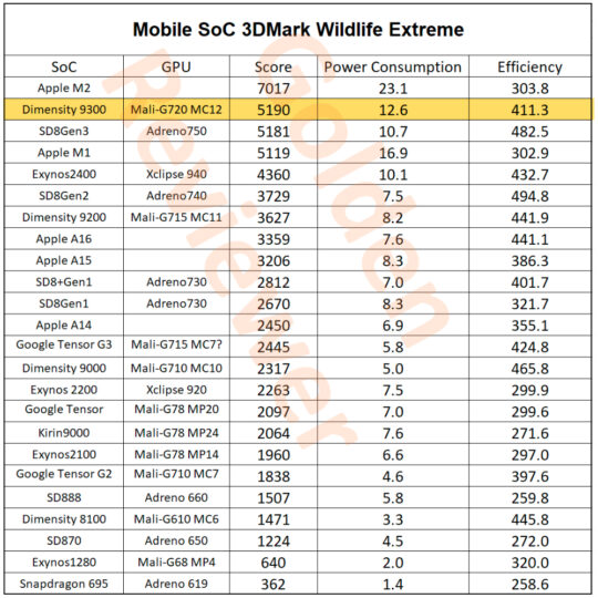 In rasterization (conventional graphics), the Exynos 2400 performs better than the Snapdragon 8 Gen 2 but lower than the Snapdragon 8 Gen 3 and the Dimensity 9300 in the 3DMark Wildlife Extreme test. This benchmark tests the graphics performance of the GPU under sustained loads and is the most sought-after benchmark among mobile enthusiasts. It is more power-efficient than the Dimensity 9300 but less efficient than the Snapdragon 8 Gen 2 or the Snapdragon 8 Gen 3. So, it looks like Samsung has made substantial progress compared to the Exynos 2200.