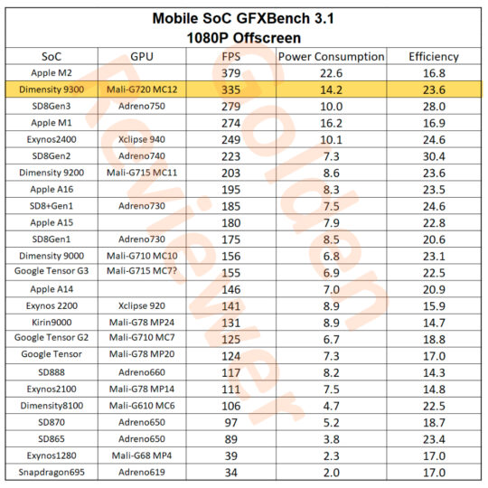 In GFXBench 3.1 (1080p resolution), the Exynos 2400 performed better than the Snapdragon 8 Gen 2 but not as good as the Snapdragon 8 Gen 3 or the Dimensity 9300. The efficiency of the Exynos 2400 is better than the Apple A16 Bionic and the Dimensity 9300, and it is as good as the Dimensity 9200 and the Snapdragon 8+ Gen 1.