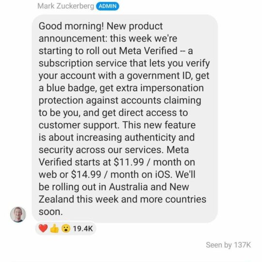 Meta Verified is now rolling out in a couple of markets, namely Australia and New Zealand, where the service costs more like $20/$25 and $24/30, respectively. Mark Zuckerberg announced that the paid verification service will be available to customers in more countries soon.