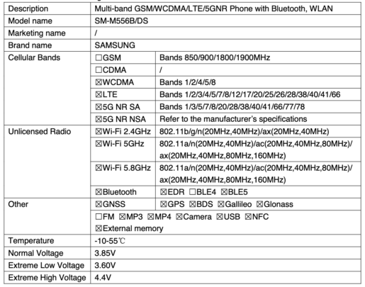 The FCC documents confirm the SM-M556B model number and the phone's dual-SIM capabilities. The application mentions a battery manufactured by Ningde Amperex Technology, identified by model number HQ-6887NAS.