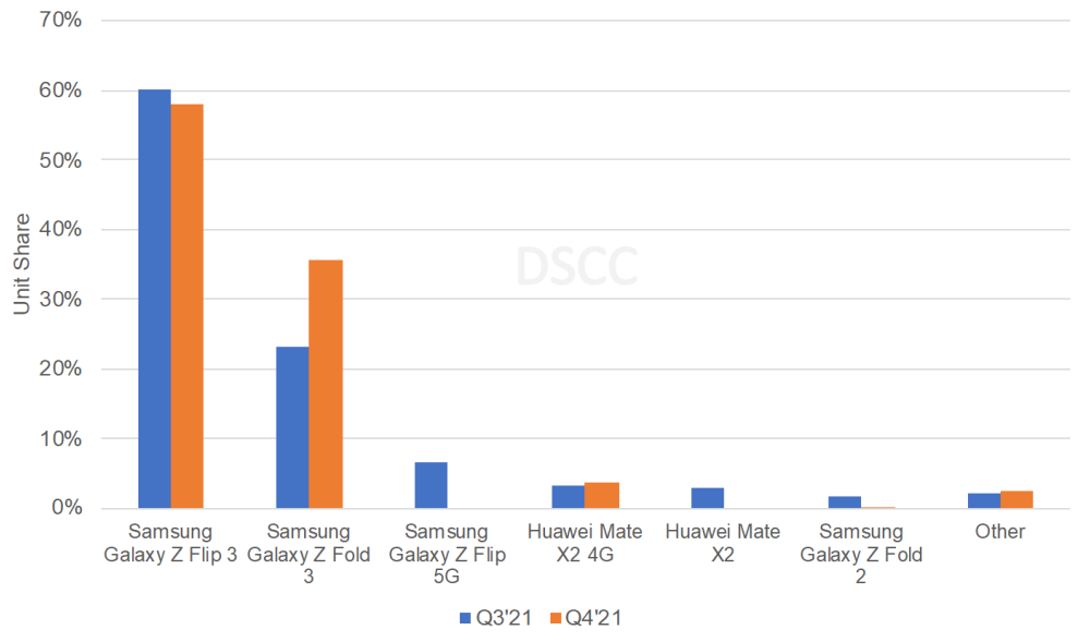 The Galaxy Z Flip 3 is expected to dominate Q4 2021 with a 58% share, though the Galaxy Z Fold 3 should catch up and cover 36% of the market.