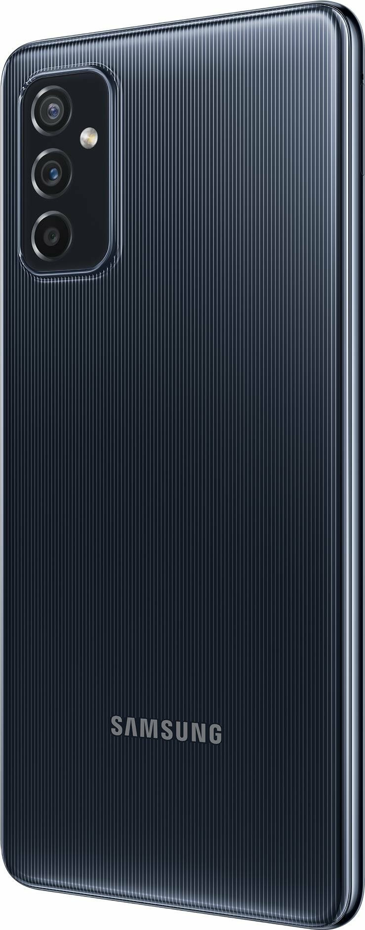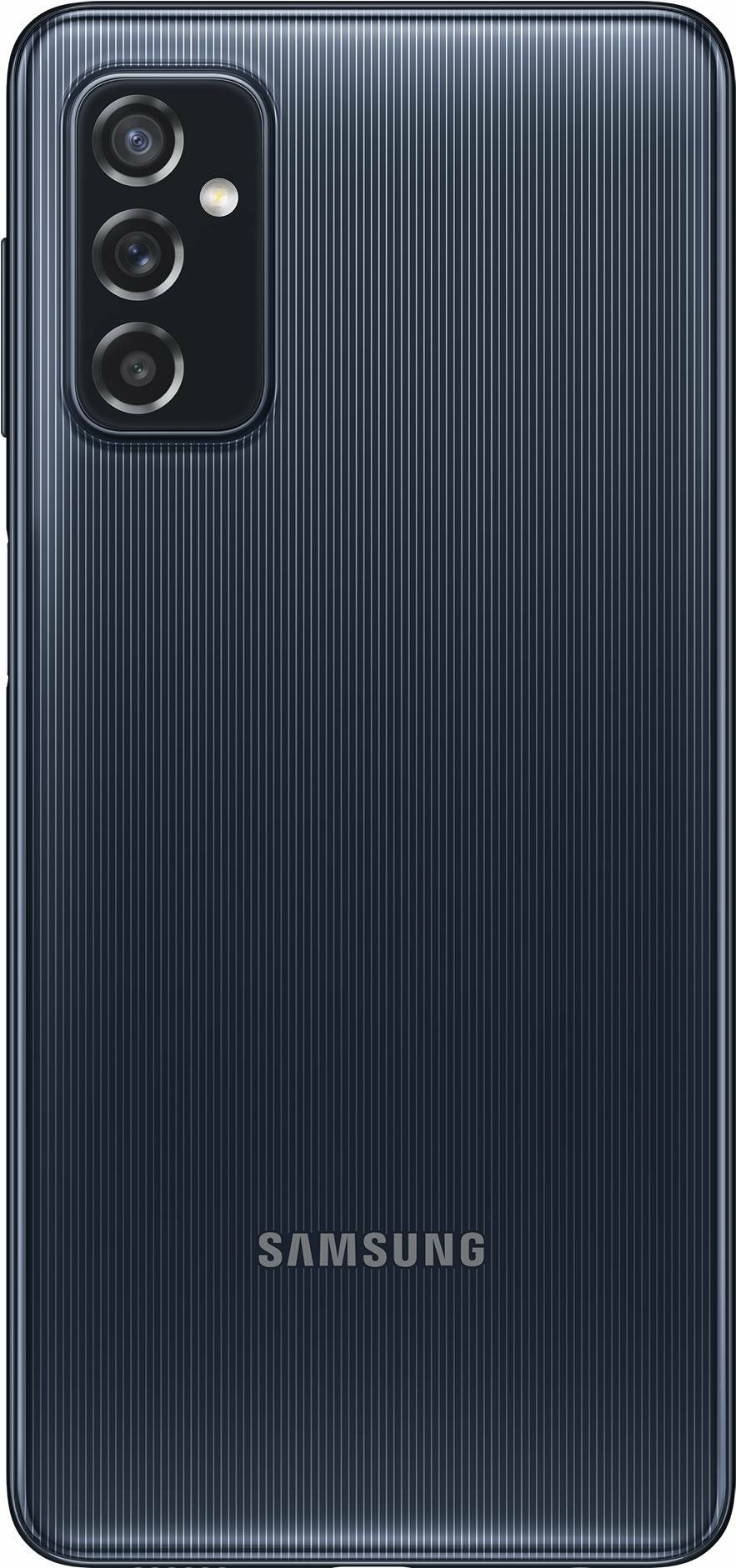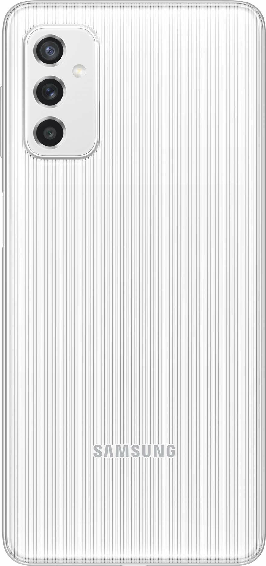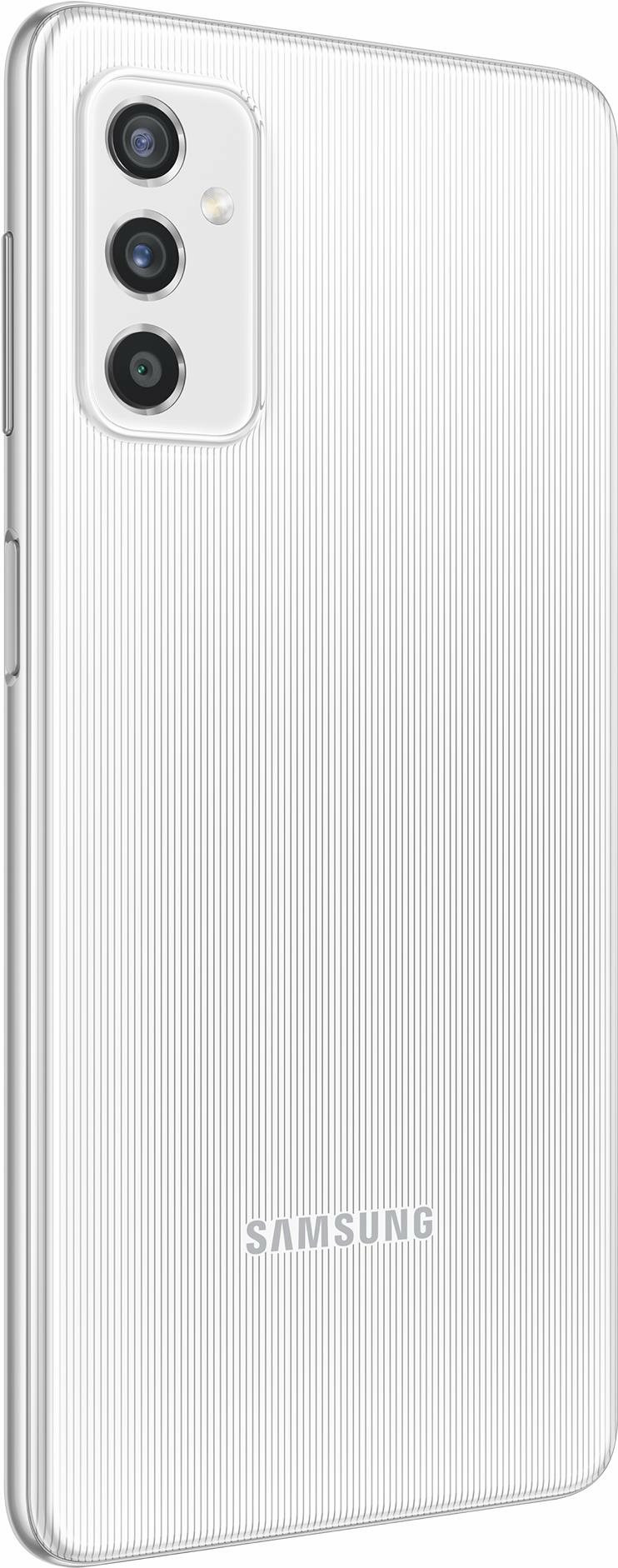 The Galaxy M52 5G can also be identified by its color-matching metallic frame and side-mounted fingerprint scanner. Three color options have been revealed — black, blue, and white — and they all have the same striped pattern, as seen in the image galleries below (via WinFuture).