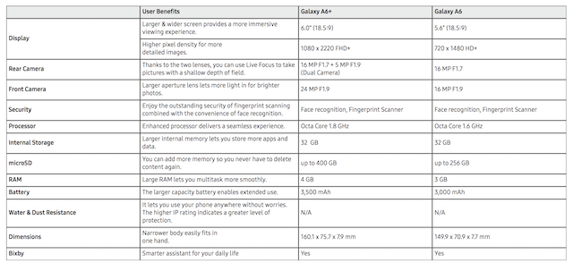 Both new mid-range handsets look quite the same but the Galaxy A6+ has a larger 6-inch 18.5:9 aspect ratio Infinity Display with 2220×1080 pixel resolution. The fingerprint sensor on both handsets is placed at the back below the camera sensor. In addition to the Infinity display, the phones also pack Dolby Atmos support, although the lack of stereo speakers means Dolby Atmos will only work with earphones.