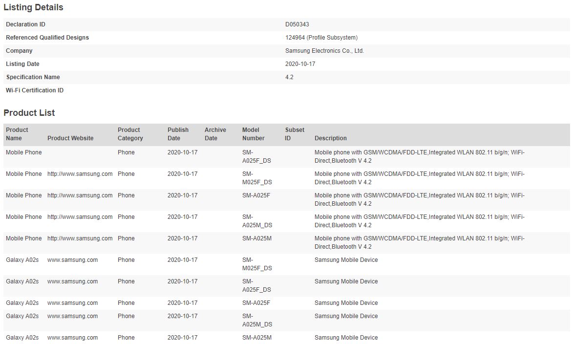And it is ‘certificate‘ – singular – because both the Galaxy A02 and the Galaxy M02 were mentioned in the same Bluetooth SIG application that addresses model numbers SM-A025F and SM-M025F. Another unusual detail is that the A-series phone is referred to as the Galaxy A02s, even though history indicates that the SM-A025F model number should correspond to a non-s Galaxy A variant.