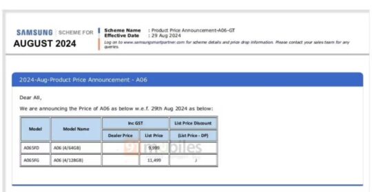 Since the letter sent to retailers says the price is effective from August 29, 2024, the phone will likely be launched within the next few days. The Galaxy A06 has a 6.7-inch LCD screen with HD+ resolution and a 60Hz refresh rate. The device has a 50MP primary rear camera, a 2MP depth sensor, and an 8MP selfie camera. It can record 1080p 60fps videos using front and rear cameras.